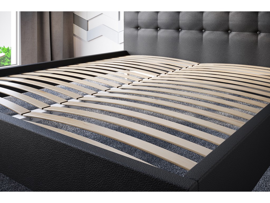 Łóżko Endo w rozmiarze 180 cm to elegancka propozycja do przestronnych sypialni. Tkanina Madryt 9100 w odcieniu czerni imituje naturalną skórę, nadając wnętrzu luksusowego charakteru. Pikowane wezgłowie pełni funkcję dekoracyjną i stanowi wygodne oparcie dla pleców podczas czytania lub oglądania TV. Stabilna konstrukcja z drewnianym stelażem zapewnia komfort codziennego użytkowania.
