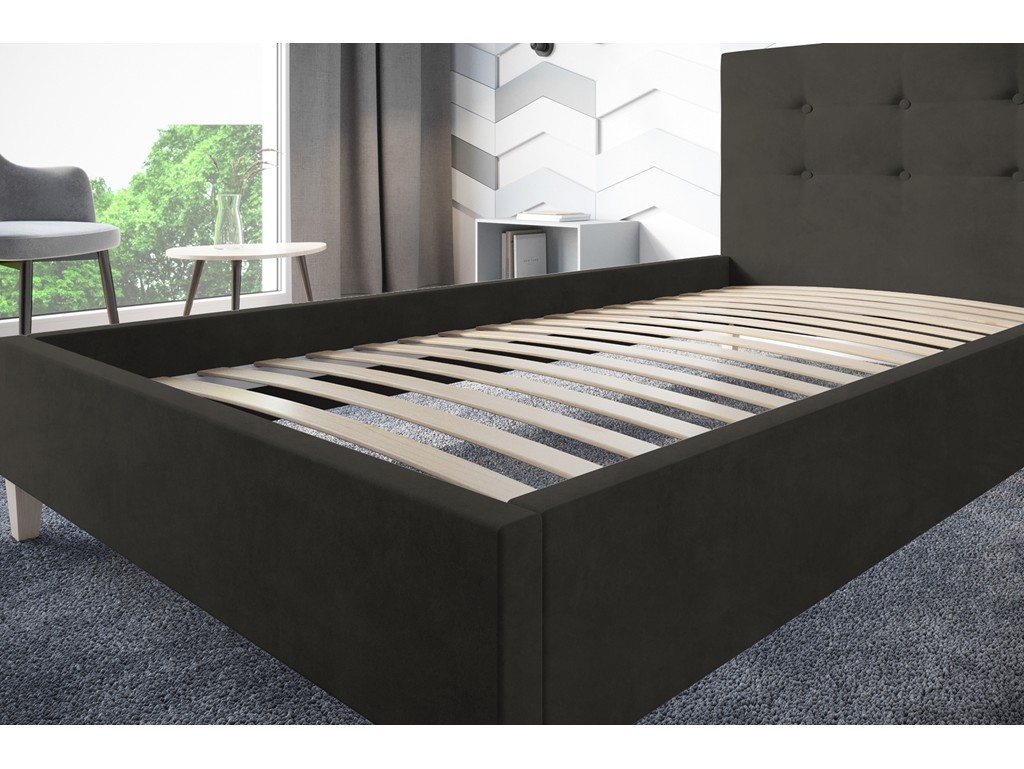 Łóżko tapicerowane Endo w rozmiarze 90 cm to idealne rozwiązanie do pokojów młodzieżowych i jednoosobowych sypialni. Tkanina Kronos 34 w odcieniu ciemnego szarego nadaje meblowi elegancki i ponadczasowy wygląd. Pikowane wezgłowie pełni funkcję dekoracyjną i stanowi wygodne oparcie dla pleców. Drewniany stelaż zapewnia stabilność i komfort codziennego użytkowania.