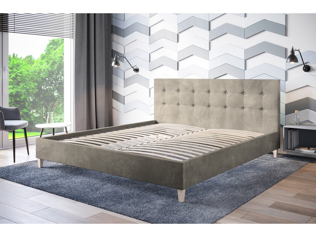 Pikowane wezgłowie dodaje subtelnego akcentu dekoracyjnego, a stabilna konstrukcja z drewnianym stelażem zapewnia wygodę codziennego użytkowania.