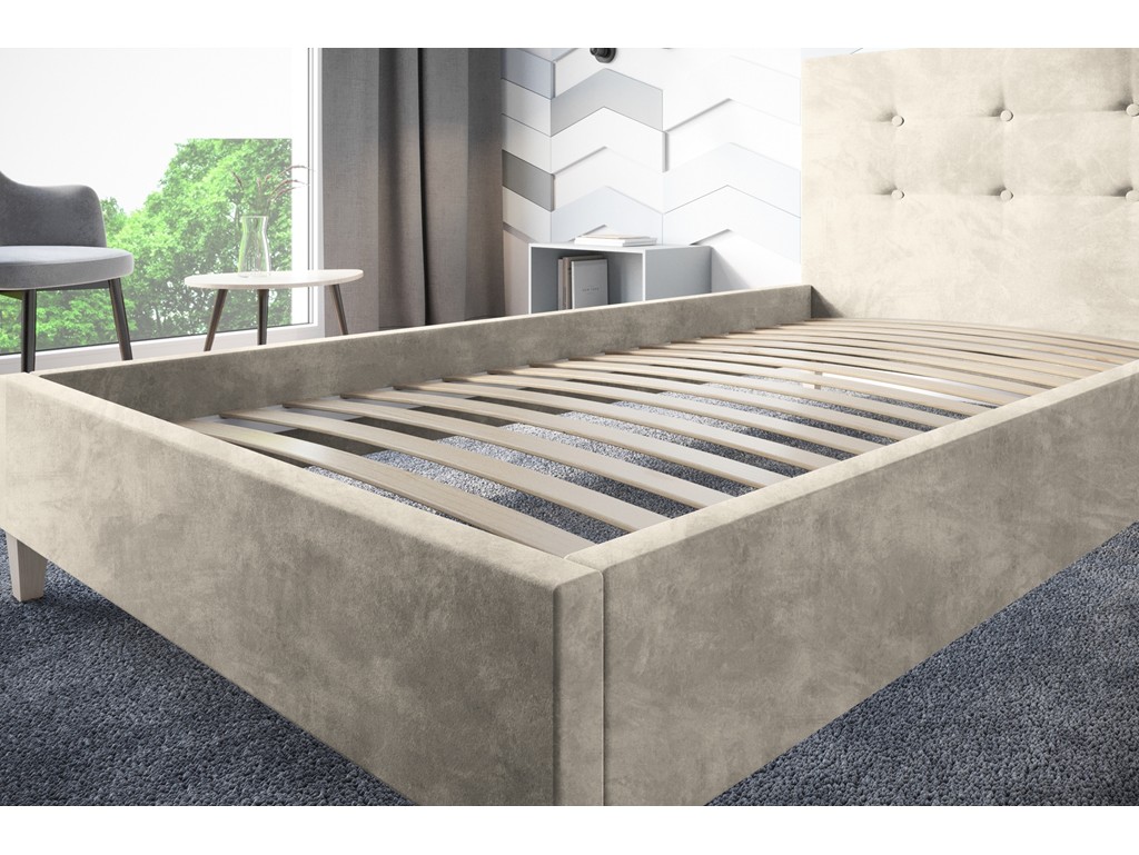 Łóżko Endo w rozmiarze 90 cm w jasnym beżowym odcieniu Riviera 21 jest kompaktowe, a jednocześnie komfortowe i stylowe.
