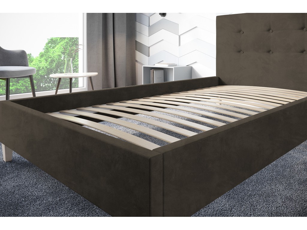 Łóżko tapicerowane Endo w rozmiarze 80 cm to kompaktowa propozycja do małych sypialni, pokoi dziecięcych lub gościnnych. Ciemnobrązowa tkanina Riviera 26 o aksamitnej strukturze nadaje łóżku przytulny i elegancki charakter. Pikowane wezgłowie pełni funkcję dekoracyjną i wygodnego oparcia, a solidna rama zapewnia stabilność.