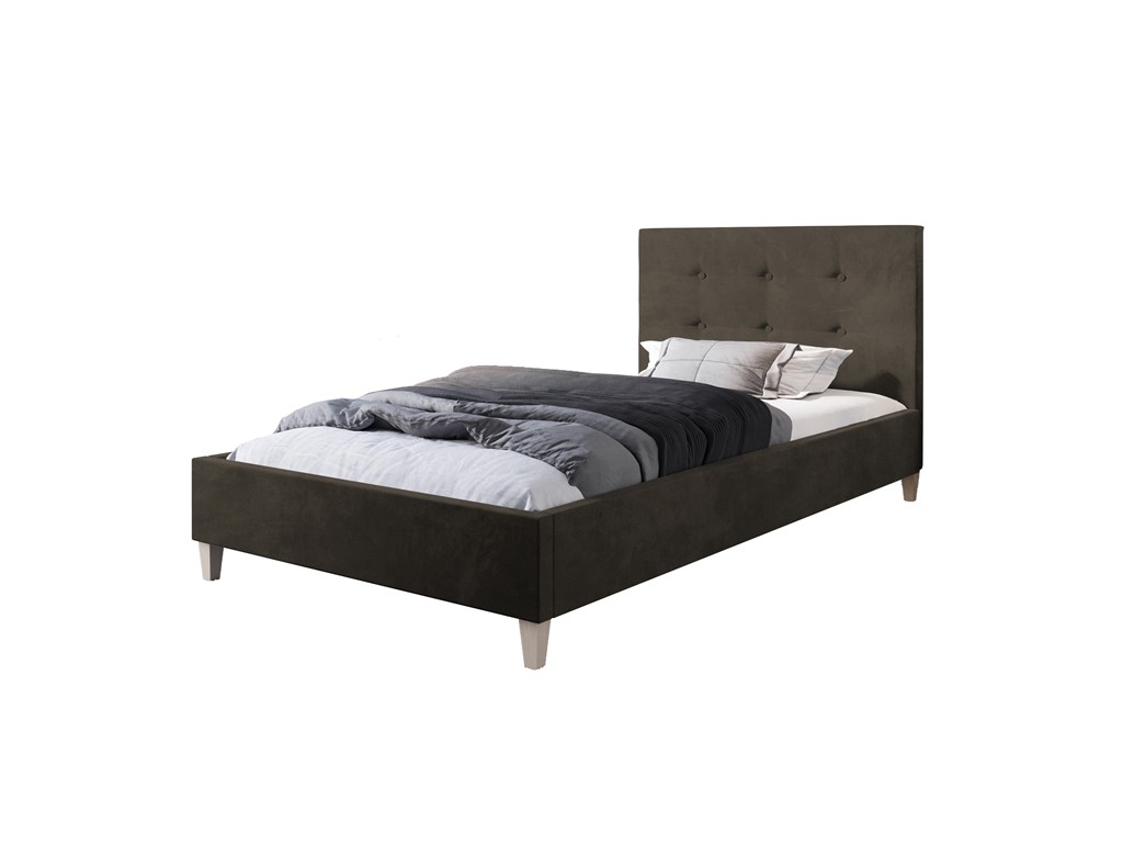Łóżko tapicerowane Endo w rozmiarze 90 cm to kompaktowe rozwiązanie do pokojów młodzieżowych, gościnnych lub niewielkich sypialni. Ciemny brąz tkaniny Riviera 26 o aksamitnej strukturze nadaje łóżku elegancki i przytulny charakter. Pikowane wezgłowie zapewnia wygodę i dekoracyjny akcent, a stabilna rama z drewnianym stelażem umożliwia dopasowanie własnego materaca.