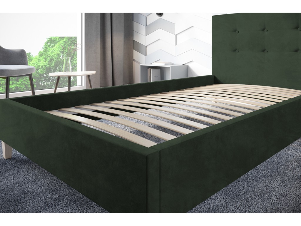 Łóżko tapicerowane Endo w rozmiarze 90 cm to kompaktowe rozwiązanie do pokoi młodzieżowych, gościnnych oraz wnętrz o niewielkim metrażu. Tkanina Riviera 38 w ciemnym zielonym kolorze, o aksamitnej i miękkiej strukturze, nadaje łóżku elegancki wygląd. Pikowane wezgłowie oraz tapicerowana rama tworzą spójną całość, a drewniany stelaż umożliwia dobór odpowiedniego materaca.
