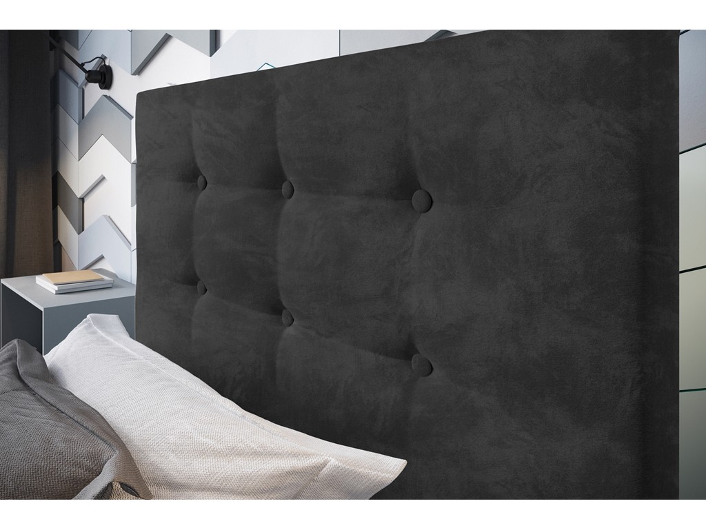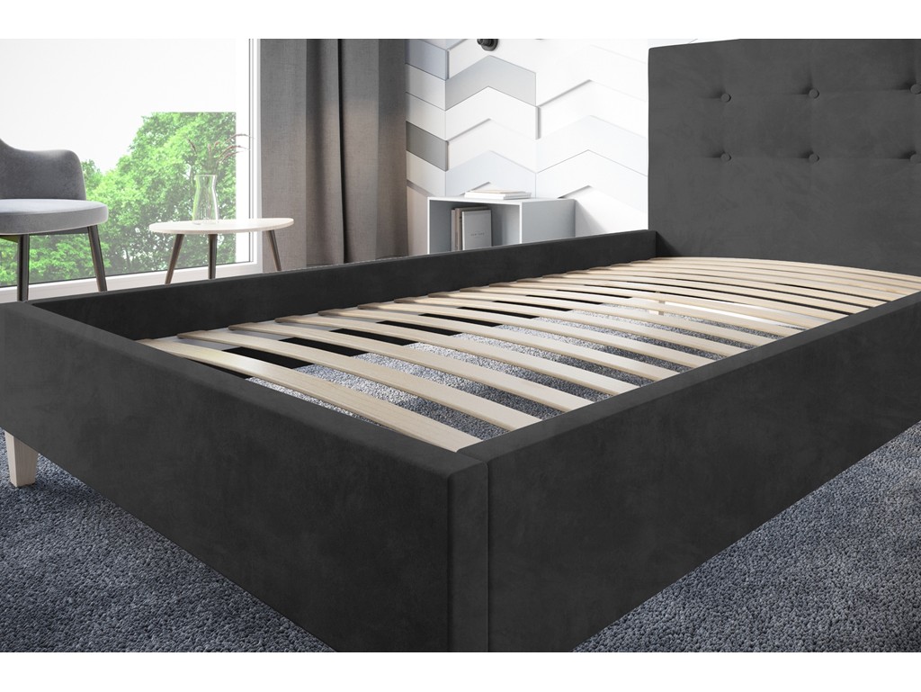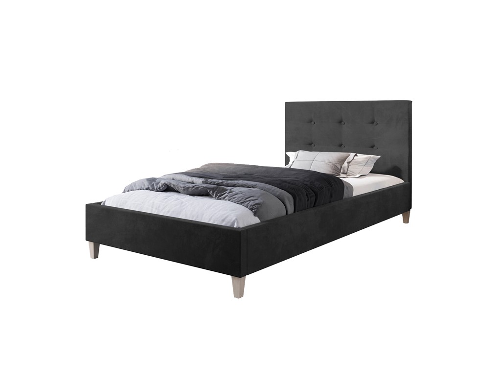 Łóżko tapicerowane Endo w rozmiarze 80 cm to kompaktowy model przeznaczony do małych sypialni, pokojów dziecięcych i kawalerek. Pikowane wezgłowie oraz aksamitna tkanina w odcieniu ciemnego szarego Riviera 95 nadają wnętrzu elegancki, spokojny charakter. Stabilna konstrukcja ze stelażem na taśmie zapewnia wygodne podparcie materaca, który można dobrać według własnych preferencji.