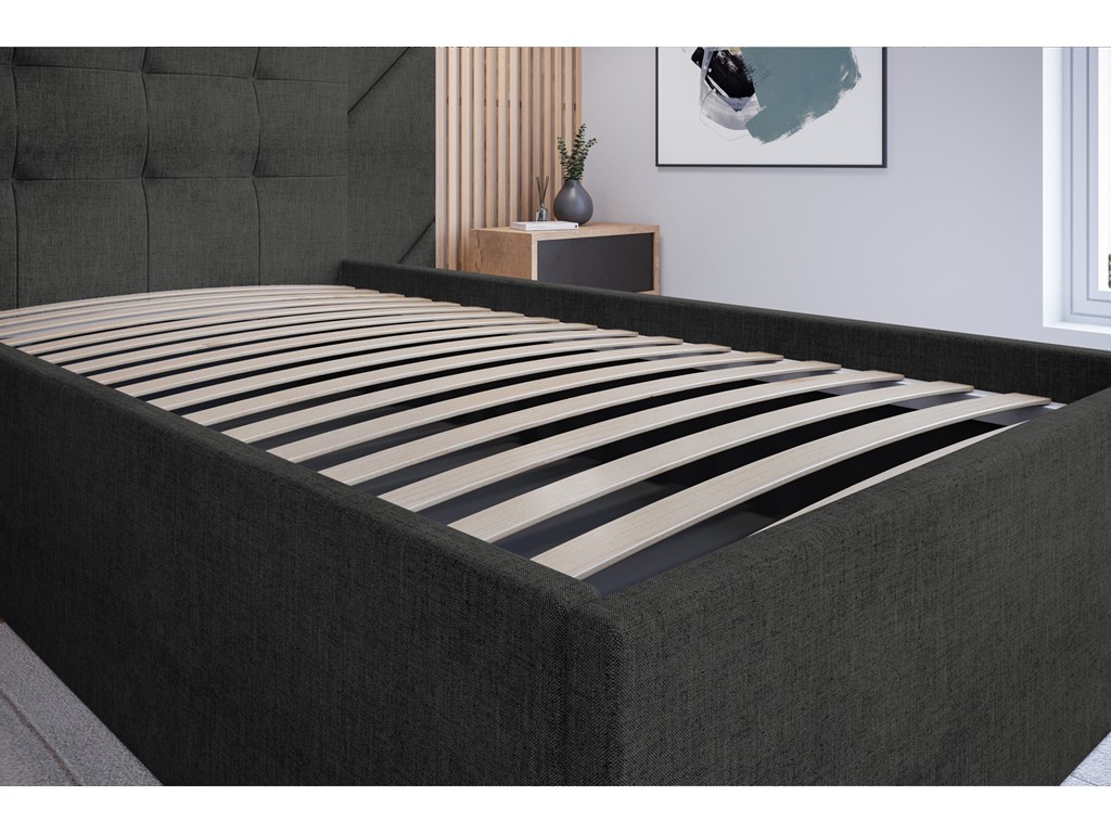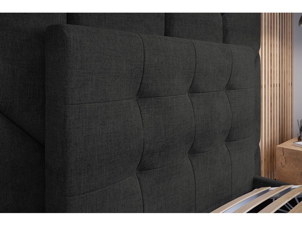 Łóżko tapicerowane Timo w rozmiarze 90 cm w tkaninie Sawana 14 w odcieniu czarnym to elegancka propozycja do sypialni. Pikowane wezgłowie zapewnia wygodne oparcie podczas wieczornego relaksu lub czytania, a solidna tapicerowana rama w połączeniu z drewnianym stelażem stabilnie podtrzymuje materac.