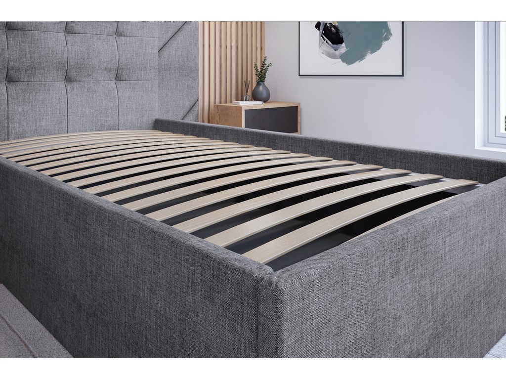 Solidna tapicerowana rama oraz drewniany stelaż gwarantują stabilność materaca, a praktyczny pojemnik pozwala na przechowywanie pościeli.