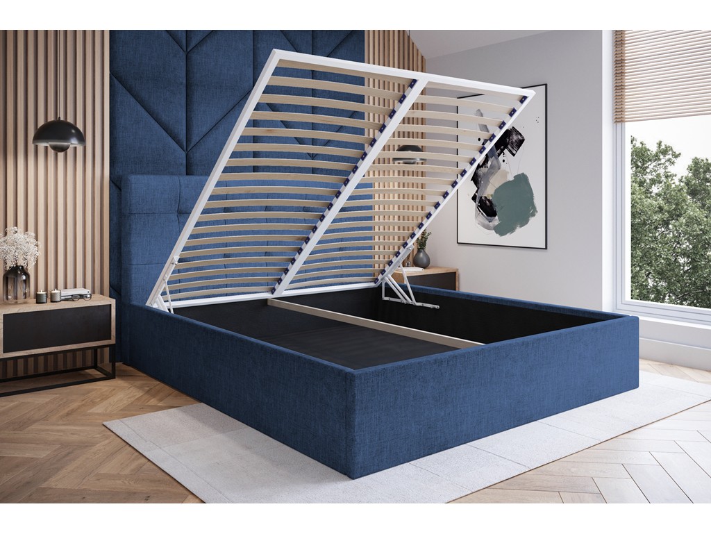 Solidna tapicerowana rama oraz drewniany stelaż gwarantują stabilność materaca, a praktyczny pojemnik pozwala na przechowywanie pościeli.