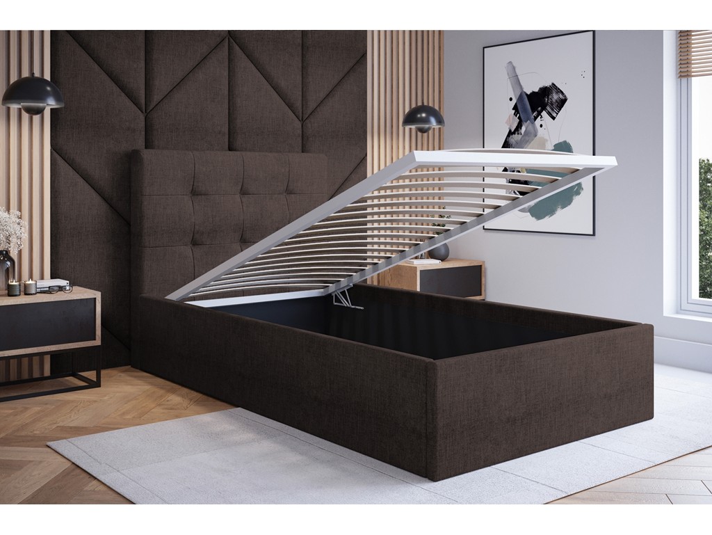 Łóżko tapicerowane Timo w rozmiarze 120 cm w tkaninie Inari 24 w brązowym odcieniu mlecznej czekolady to elegancka propozycja do sypialni, która łączy styl z funkcjonalnością. Wbudowany pojemnik pod stelażem pełni funkcję dodatkowego schowka, a miękkie wezgłowie zapewnia komfortowy odpoczynek.
