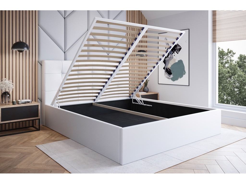 Łóżko tapicerowane Timo w rozmiarze 180 cm w tkaninie Madryt 920 w odcieniu białym to elegancka propozycja do jasnej, nowoczesnej sypialni. Wbudowany pojemnik pod stelażem umożliwia praktyczne przechowywanie pościeli, a ekoskóra Madryt jest łatwa w czyszczeniu i cechuje się wysoką odpornością na ścieranie.