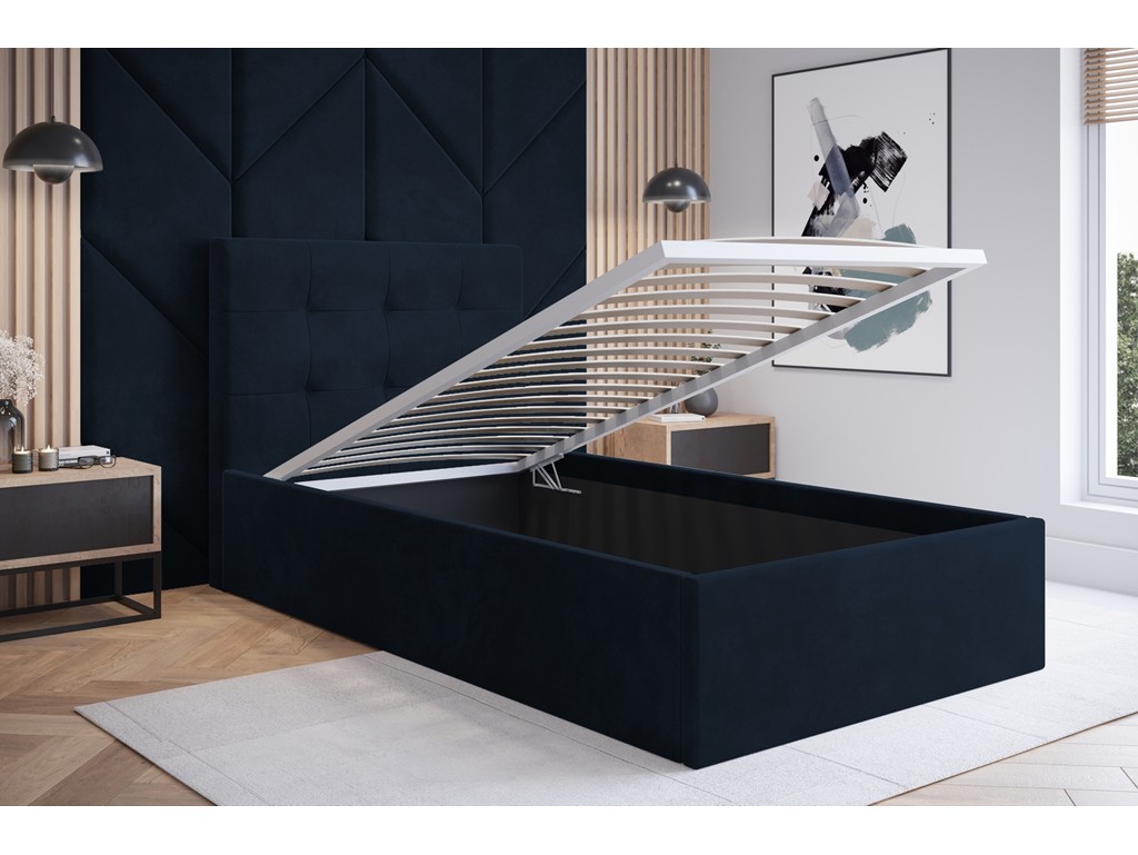Łóżko tapicerowane Timo w rozmiarze 80 cm w tkaninie Monolith 79 w odcieniu ciemnego granatu to kompaktowe i stylowe rozwiązanie do pokoju dziecięcego, niewielkiej sypialni lub kawalerki. Wbudowany pojemnik na pościel pozwala na praktyczne wykorzystanie przestrzeni, a głęboki granatowy odcień nadaje wnętrzu wyrazistego charakteru.
