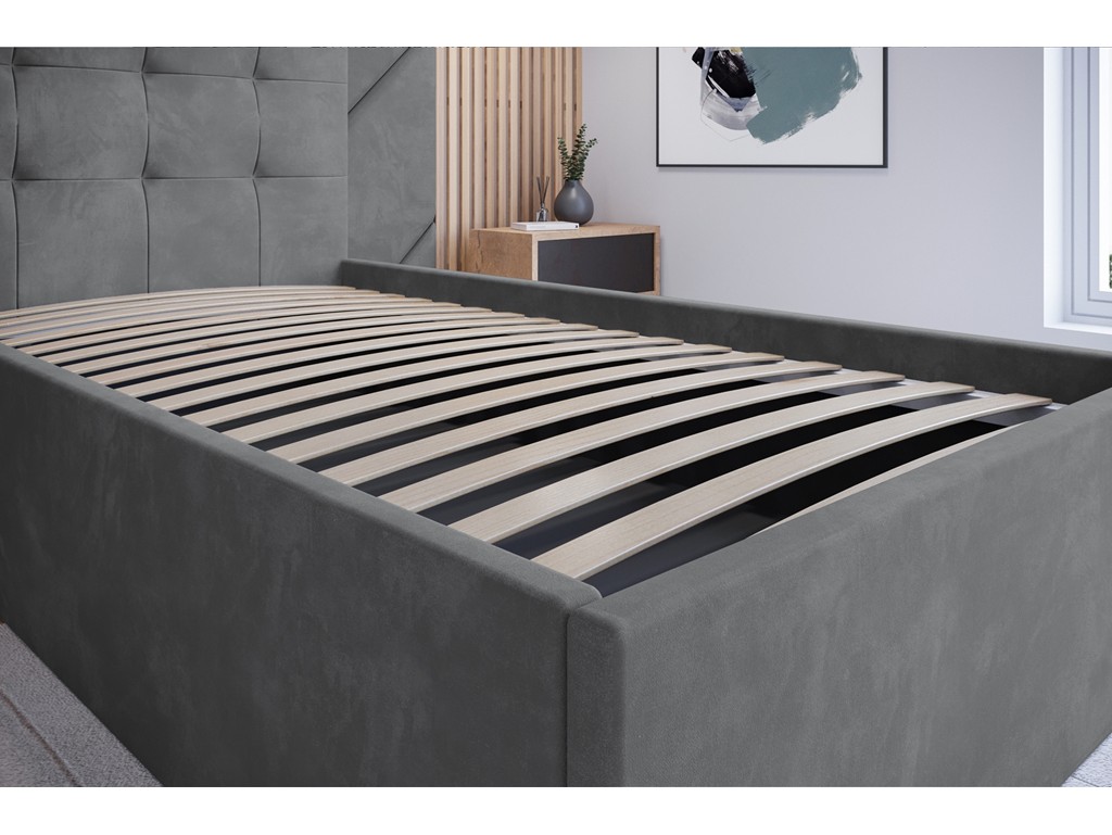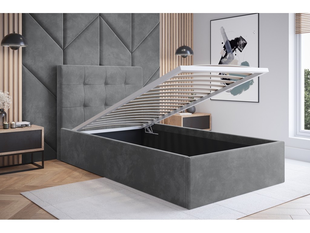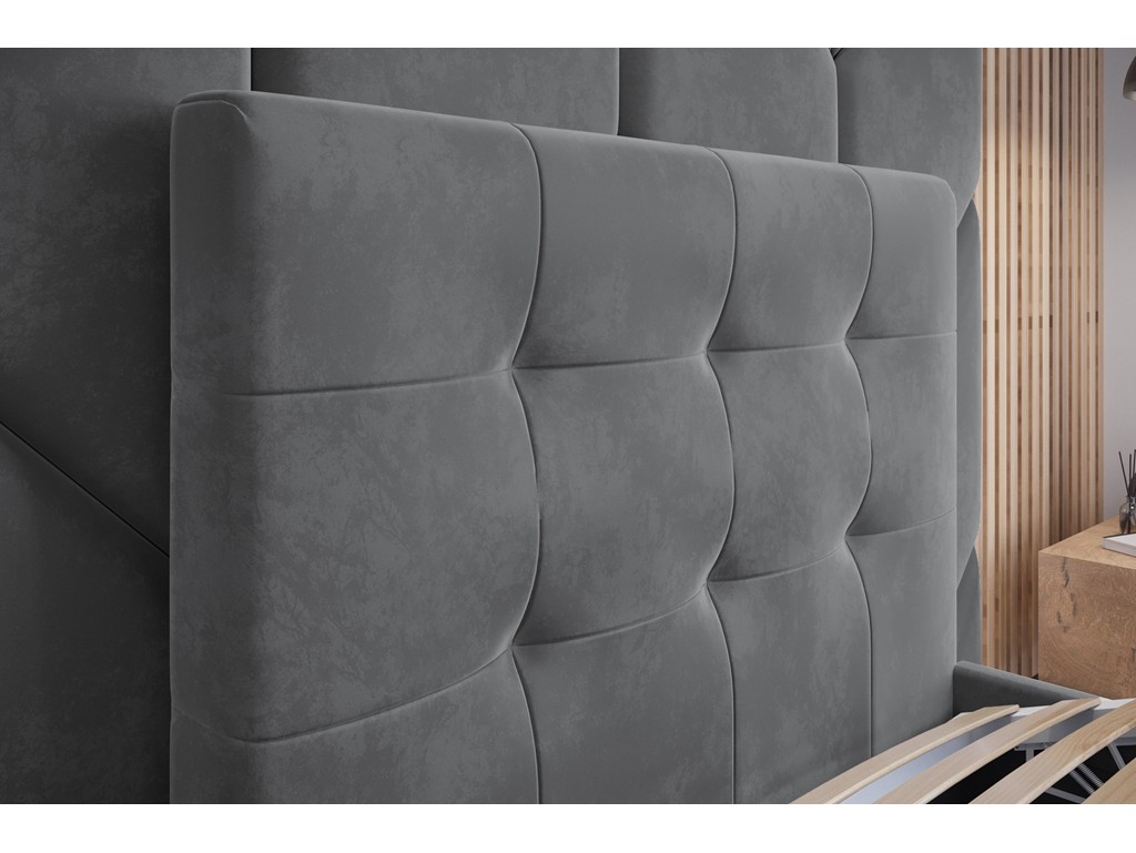 Pikowane wezgłowie zapewnia wygodę, pojemnik na pościel pozwala na praktyczne przechowywanie tekstyliów, a solidna konstrukcja i trwała tkanina gwarantują estetyczny wygląd przez wiele lat.