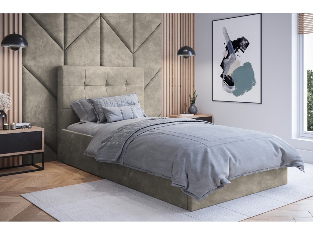 Pikowane wezgłowie zapewnia komfort odpoczynku, pojemnik pod stelażem pozwala na wygodne przechowywanie pościeli, a solidna konstrukcja i wytrzymała tkanina gwarantują trwałość mebla.