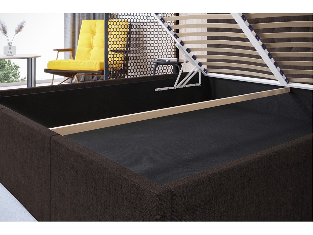 Ciepła, stonowana tapicerka wprowadza do sypialni przytulność i elegancję, a pojemnik pod stelażem zwiększa funkcjonalność mebla.