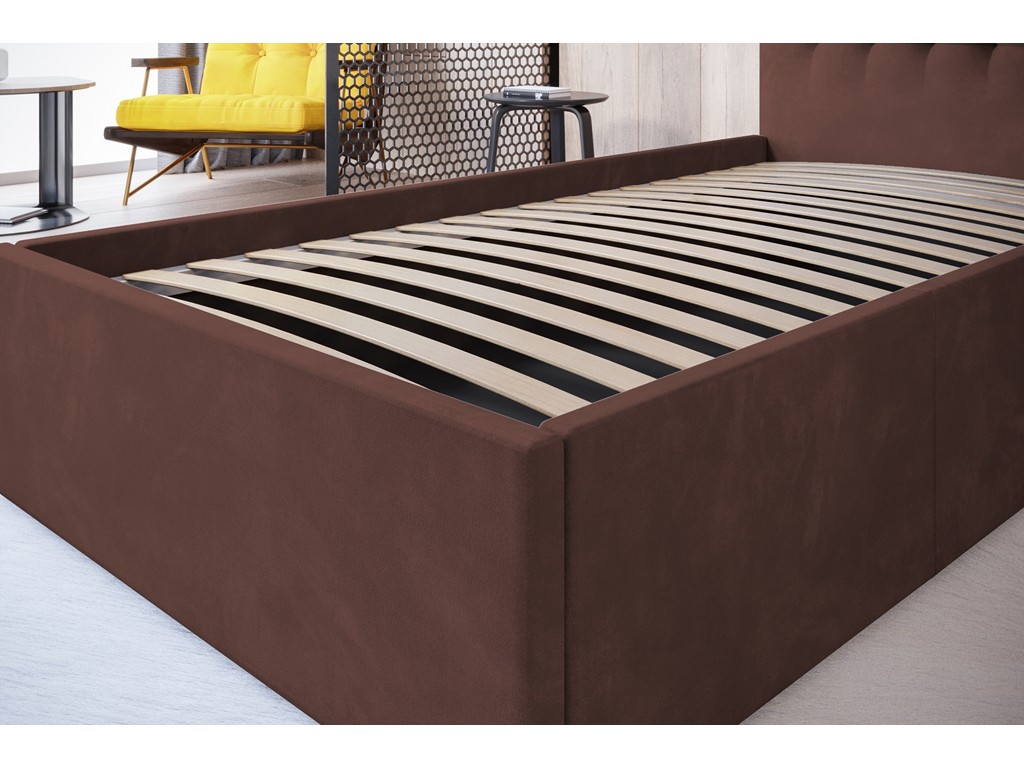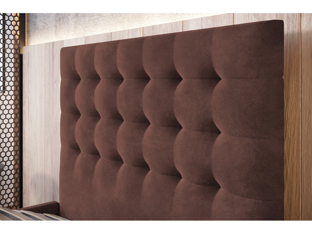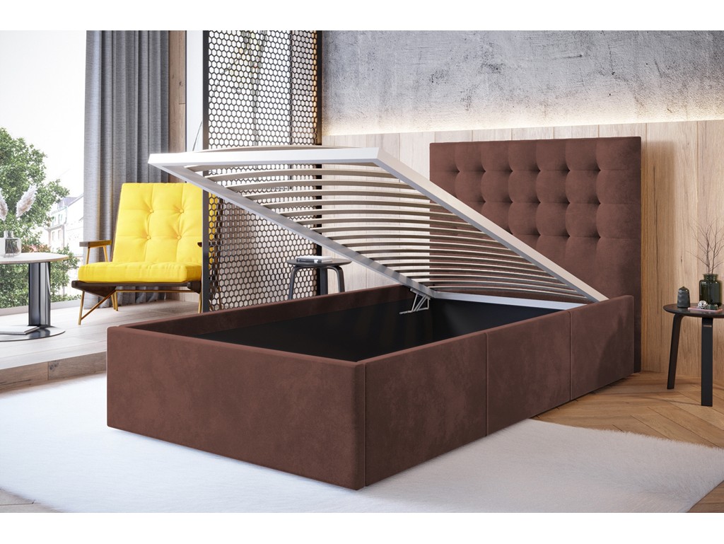 Pikowane wezgłowie zwiększa wygodę odpoczynku, a pojemnik pod stelażem pozwala wygodnie przechowywać pościel.