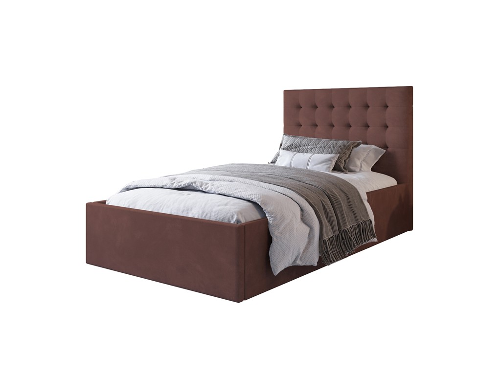 Łóżko tapicerowane Prato w rozmiarze 80 cm w tkaninie Kronos 29 w kolorze łososiowym to praktyczne i eleganckie rozwiązanie do pokoju gościnnego lub niewielkiej sypialni. Pluszowy welwet nadaje łóżku subtelny połysk i miękkość w dotyku, a pikowane wezgłowie zapewnia wygodne oparcie pleców podczas odpoczynku. Stabilna tapicerowana rama i drewniany stelaż gwarantują solidną konstrukcję, a pojemnik pod stelażem ułatwia przechowywanie pościeli.