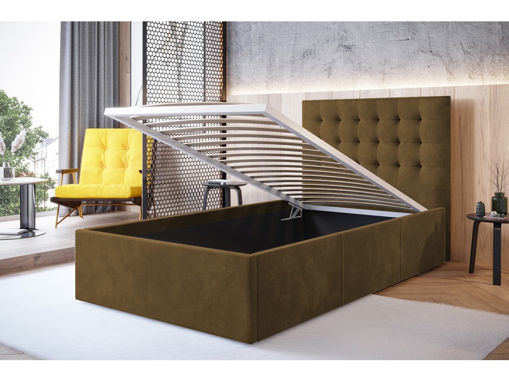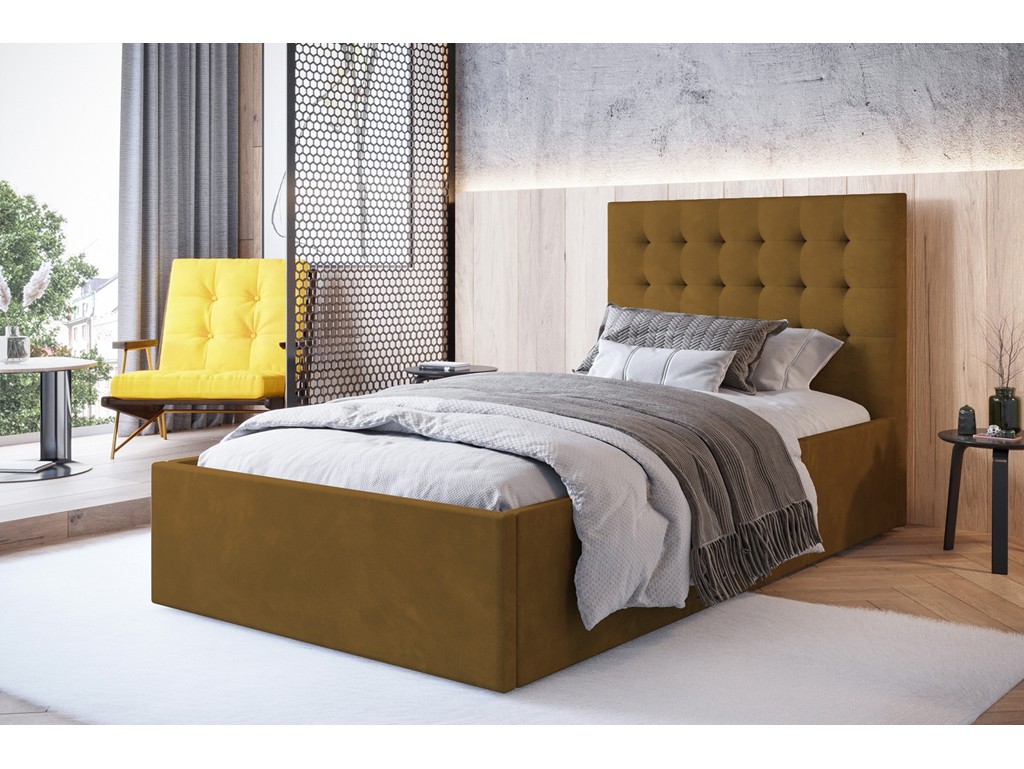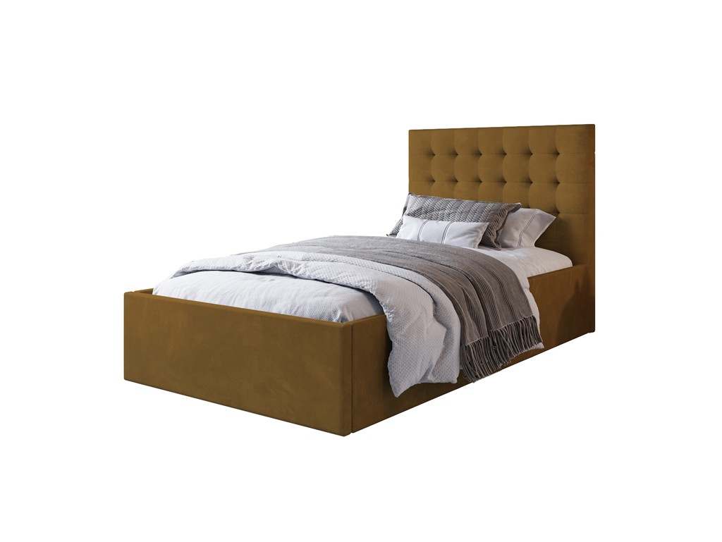 Łóżko tapicerowane Prato w rozmiarze 90 cm w tkaninie Monolith 48 w kolorze miodowym to funkcjonalne rozwiązanie do pokoju młodzieżowego, gościnnego lub kawalerki. Pikowane wezgłowie zapewnia wygodne podparcie pleców i podkreśla elegancki charakter mebla. Tapicerowana rama oraz drewniany stelaż dbają o stabilność konstrukcji.