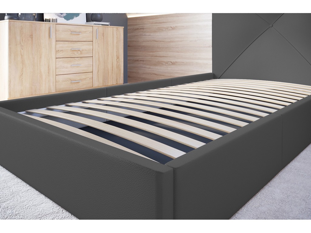 Łóżko tapicerowane Rino w rozmiarze 90 cm w szarej ekoskórze Madryt 995 to funkcjonalna propozycja do pokoju dziecięcego, kawalerki lub wnętrz gościnnych. Pikowane wezgłowie pełni funkcję dekoracyjną i stanowi wygodne oparcie dla pleców podczas odpoczynku. Drewniany stelaż na taśmie zapewnia stabilne podparcie materaca, a pojemnik pod stelażem ułatwia przechowywanie pościeli.