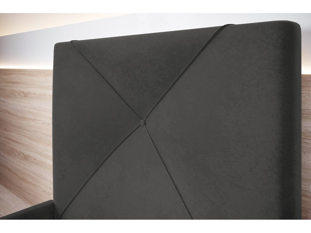 Pikowane wezgłowie stanowi wygodne oparcie dla pleców, a pojemnik pod stelażem umożliwia przechowywanie pościeli.
