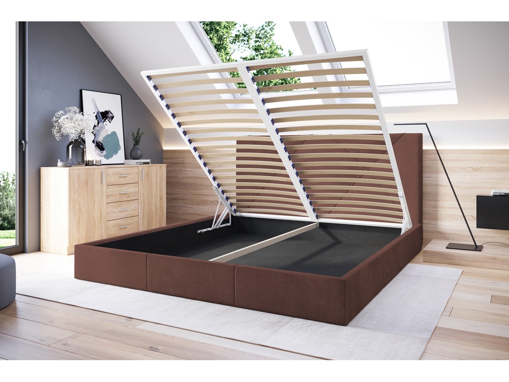Łóżko Rino w rozmiarze 140 cm w tkaninie Kronos 29 w łososiowym kolorze to funkcjonalne rozwiązanie o nowoczesnym charakterze.