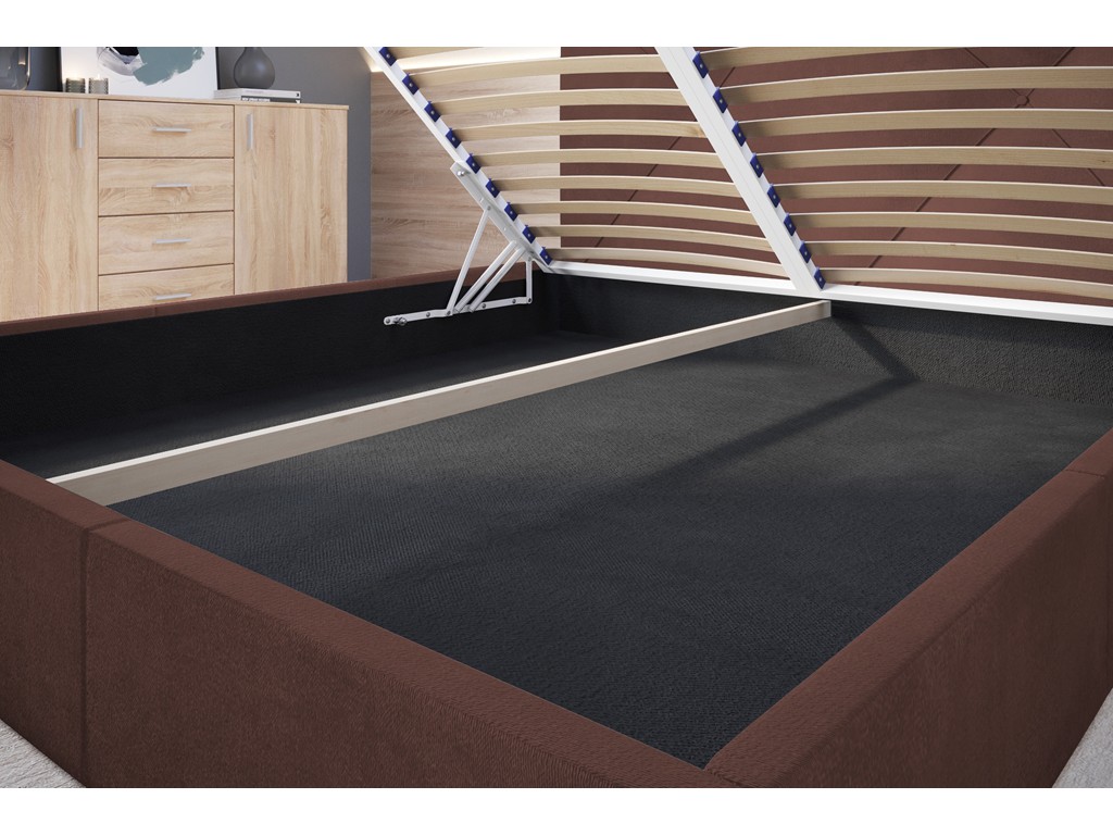 Duża powierzchnia spania zapewnia swobodę i komfort, a pojemnik pod stelażem pomaga w organizacji przestrzeni.