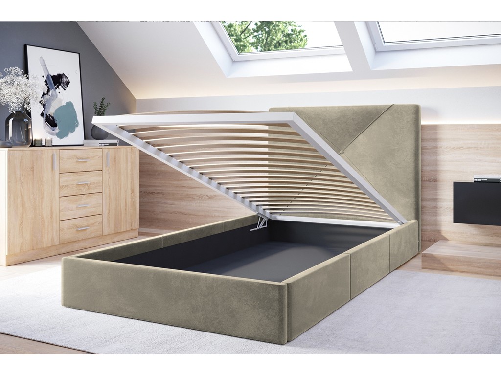 Pojemnik pod stelażem zwiększa funkcjonalność, pozwalając na wygodne przechowywanie pościeli.
