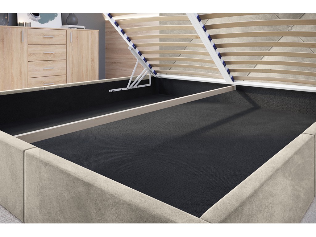 Łóżko Rino w rozmiarze 180 cm w tkaninie Riviera 21 w odcieniu jasnego beżu łączy elegancki wygląd z praktycznymi rozwiązaniami.