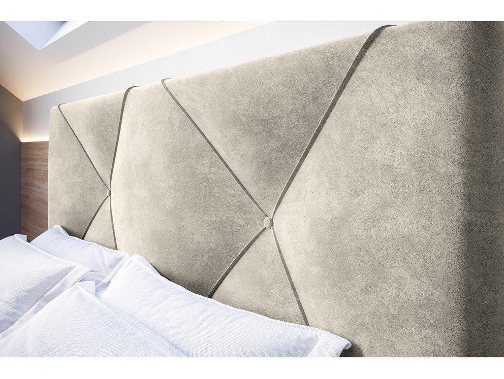 Jasny kolor tkaniny dodaje wnętrzu lekkości i harmonii, a pikowane wezgłowie zapewnia wygodne podparcie pleców przy relaksie czy czytaniu.
