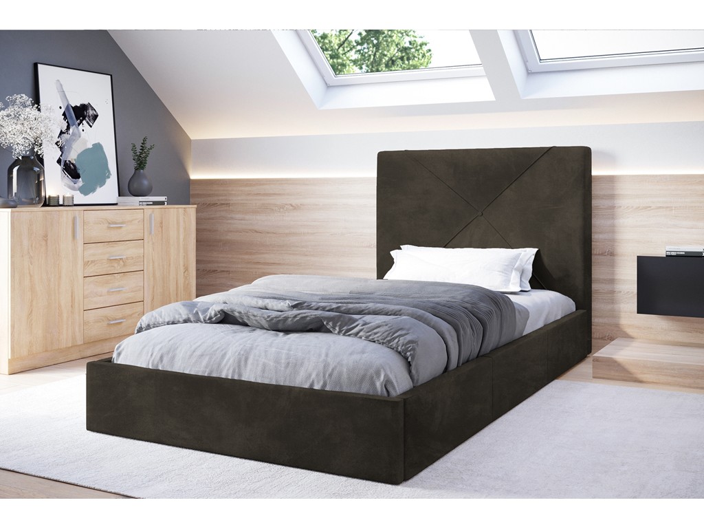Łóżko tapicerowane Rino w rozmiarze 80 cm to idealne rozwiązanie do bardzo kompaktowych wnętrz, pokoi dziecięcych, kawalerek lub apartamentów na wynajem. Tkanina Riviera 26 w odcieniu ciemnego brązu dodaje wnętrzu przytulności i elegancji. Pikowane wezgłowie pełni funkcję dekoracyjną i stanowi wygodne oparcie dla pleców.