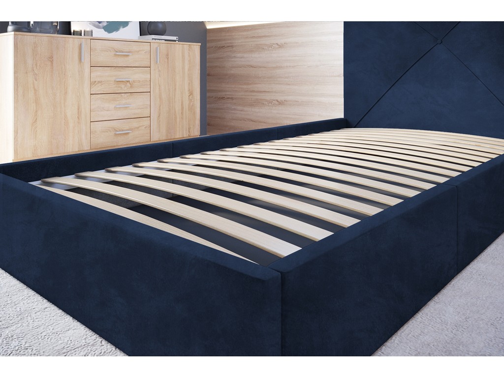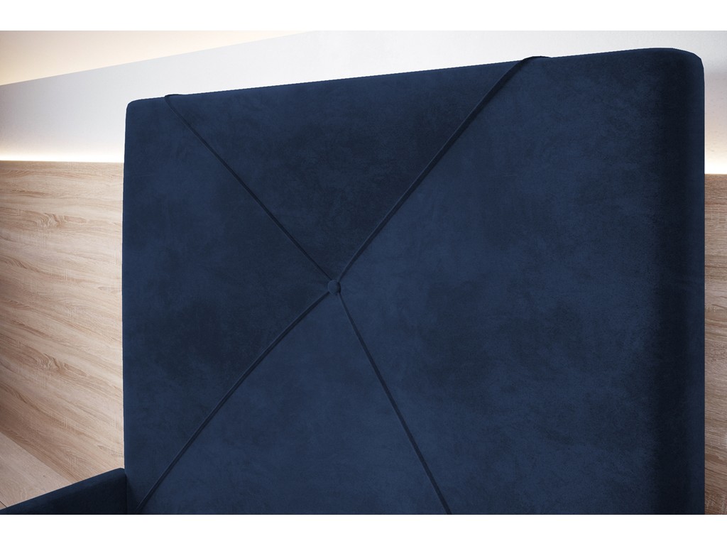 Łóżko Rino w rozmiarze 90 cm w tkaninie Riviera 81 w kolorze granatowym doskonale sprawdzi się w mniejszych przestrzeniach.
