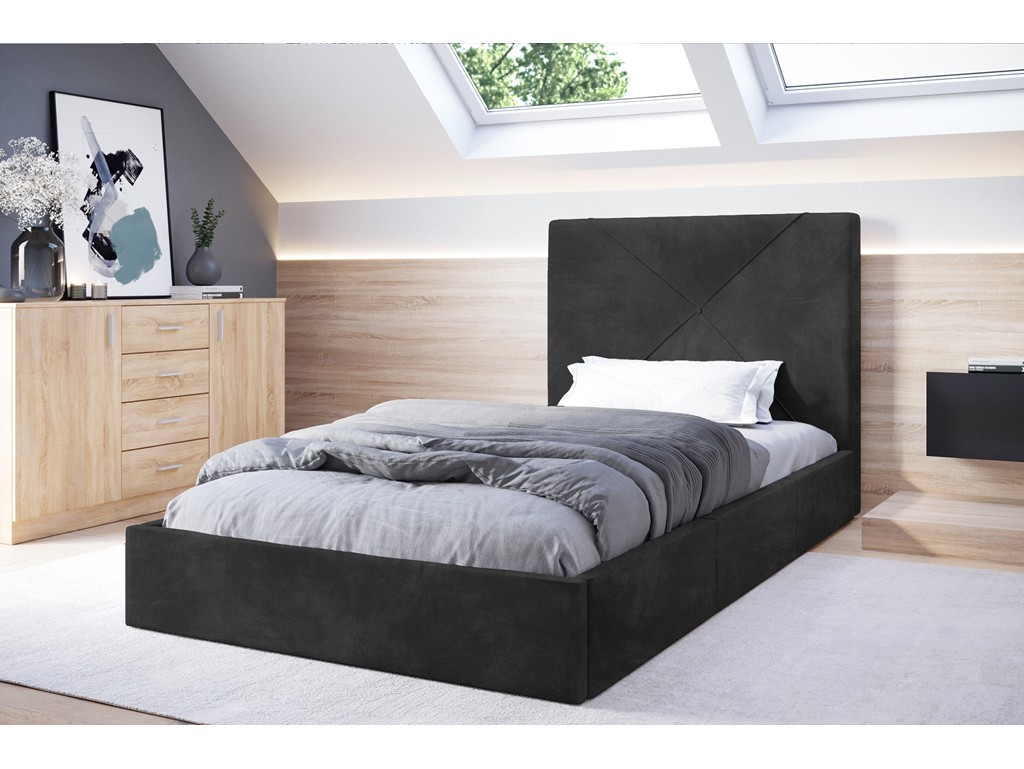 Łóżko tapicerowane Rino w rozmiarze 80 cm w tkaninie Riviera 95 w odcieniu ciemnej szarości to kompaktowe rozwiązanie do mniejszych sypialni, kawalerek lub pokoi dziecięcych. Pikowane wezgłowie pełni funkcję dekoracyjną i stanowi wygodne oparcie dla pleców. Drewniany stelaż zapewnia stabilne podparcie dla materaca, a pojemnik na pościel zwiększa praktyczność mebla.