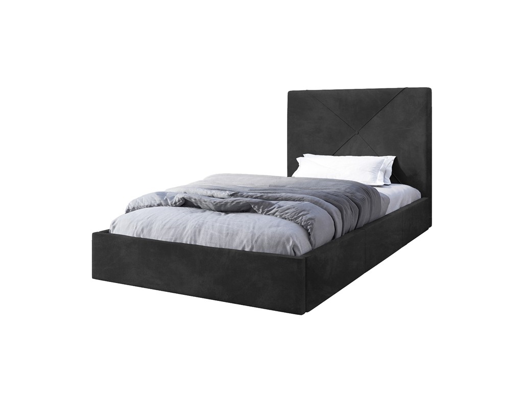 Łóżko Rino w rozmiarze 90 cm w tkaninie Riviera 95 w ciemnym szarym kolorze łączy kompaktowe wymiary z funkcjonalnym designem.