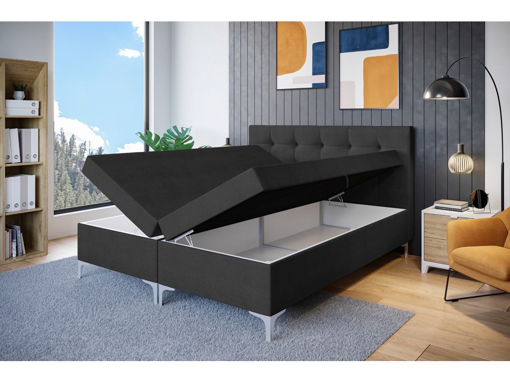 Dwa pojemniki ułatwiają utrzymanie porządku, a wysokie nóżki chromowane optycznie odciążają bryłę łóżka.