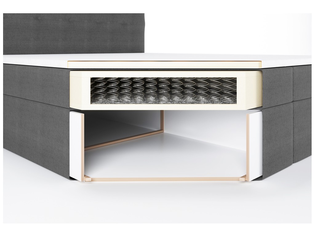 Czy powierzchnia spania wykonana jest z tej samej tkaniny co tapicerka łóżka? - Nie, powierzchnia spania została wykonana z dedykowanej czarnej tkaniny obiciowej materacowej. Takie rozwiązanie poprawia cyrkulację powietrza, zwiększa komfort snu i zapobiega ślizganiu się pościeli.