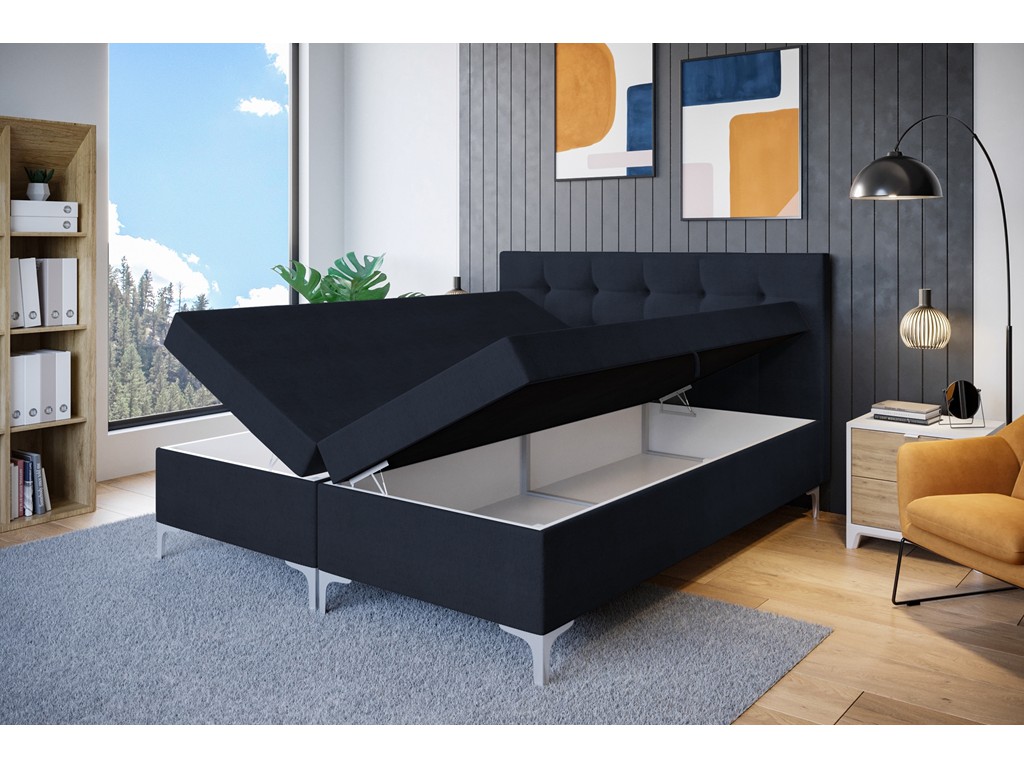 Łóżko Lilu w rozmiarze 160 cm to funkcjonalny model kontynentalny, idealny do średniej wielkości sypialni. Tkanina Sawana 80 w kolorze niebieski jeans wyróżnia się subtelnym splotem i przyjemną w dotyku strukturą. Wbudowany materac bonelowy zapewnia stabilny i komfortowy sen, a dwa pojemniki na pościel zwiększają funkcjonalność mebla.