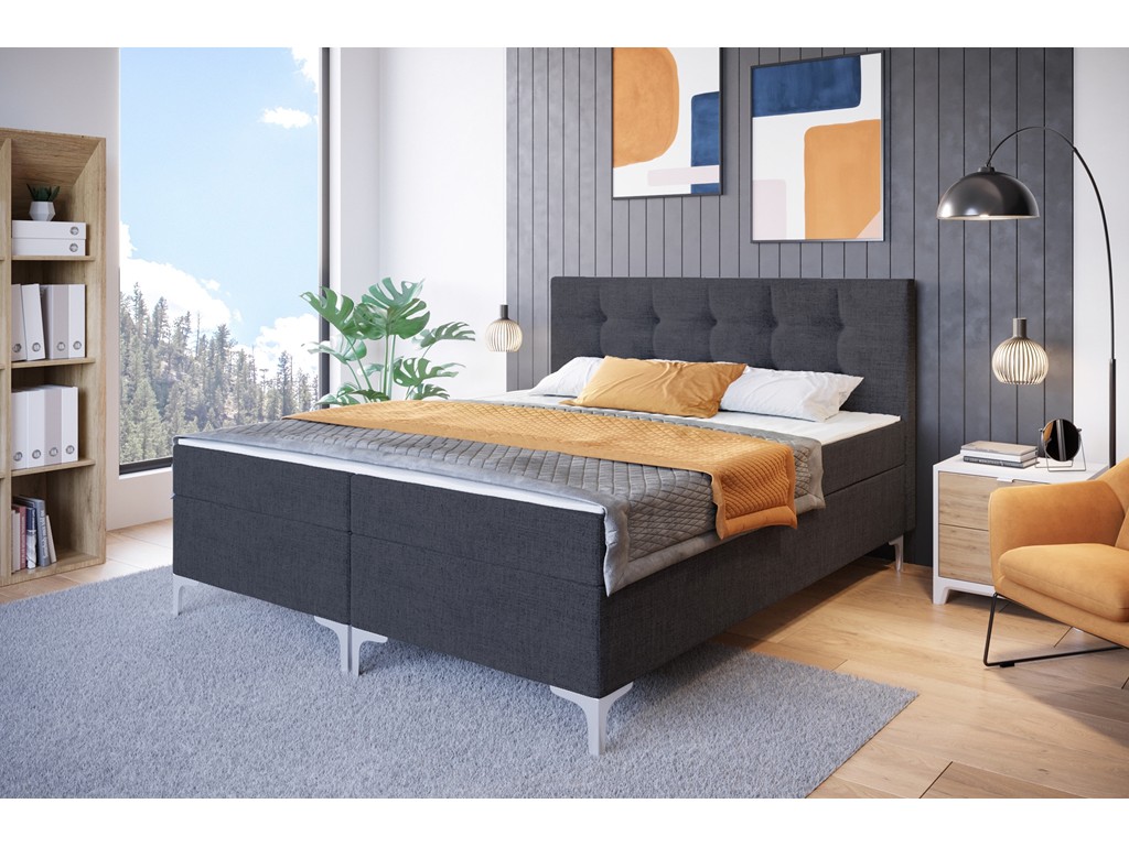 Łóżko Lilu w rozmiarze 180 cm to elegancki model kontynentalny na wysokich chromowanych nóżkach, zaprojektowany z myślą o nowoczesnych i stonowanych wnętrzach. Tkanina Inari 96 w odcieniu ciemnego szarego wyróżnia się naturalnym, lnianym charakterem i subtelną strukturą. Wbudowany materac bonelowy zapewnia stabilne podparcie ciała, a dwa pojemniki na pościel ułatwiają codzienną organizację przestrzeni. Całość łączy estetykę z funkcjonalnością na wysokim poziomie.