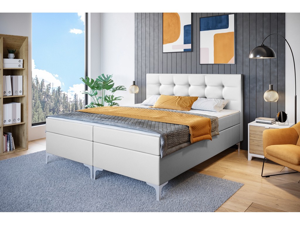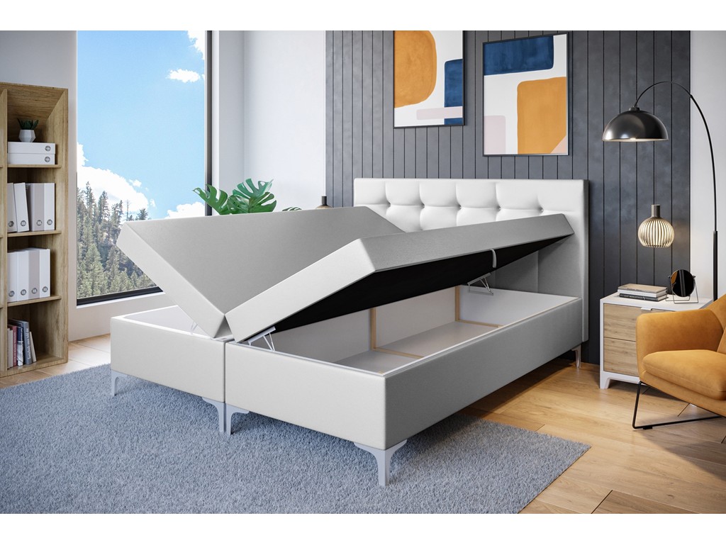 Łóżko kontynentalne Lilu w rozmiarze 140 cm łączy elegancję z funkcjonalnością w kompaktowych sypialniach. Tapicerka Madryt 920 w białym kolorze imituje skórę i optycznie powiększa przestrzeń. Pikowane wezgłowie podnosi komfort, a chromowane nóżki nadają bryle lekkości. Dwa pojemniki na pościel i materac bonelowy zapewniają wygodę codziennego użytkowania.