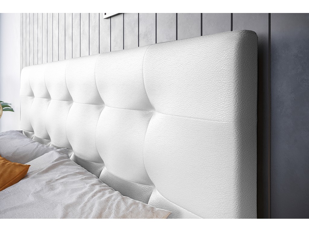 Biała tapicerka optycznie powiększa przestrzeń, a pikowane wezgłowie zapewnia wygodne oparcie.