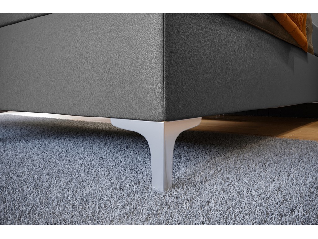 Pikowane wezgłowie i wysokie nóżki chromowane podkreślają elegancki charakter sypialni.