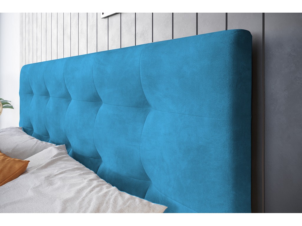 Łóżko Lilu w rozmiarze 180 cm łączy elegancję z funkcjonalnością w nowoczesnej sypialni. Tkanina Kronos 13 w lazurowym odcieniu jest aksamitna, miękka i przyjemna w dotyku, z subtelnym cieniowaniem dodającym głębi kolorowi. Pikowane wezgłowie oraz wysokie nóżki chromowane zapewniają komfort i lekkość wizualną, a dwa pojemniki na pościel w białym laminacie ułatwiają organizację przestrzeni.