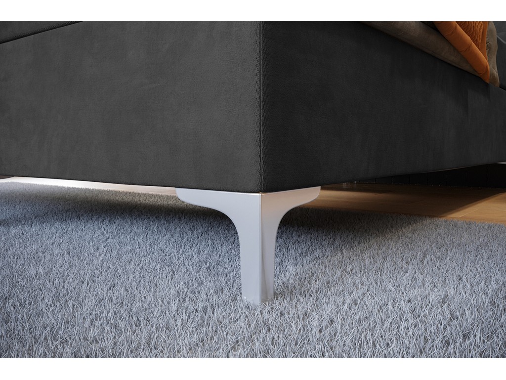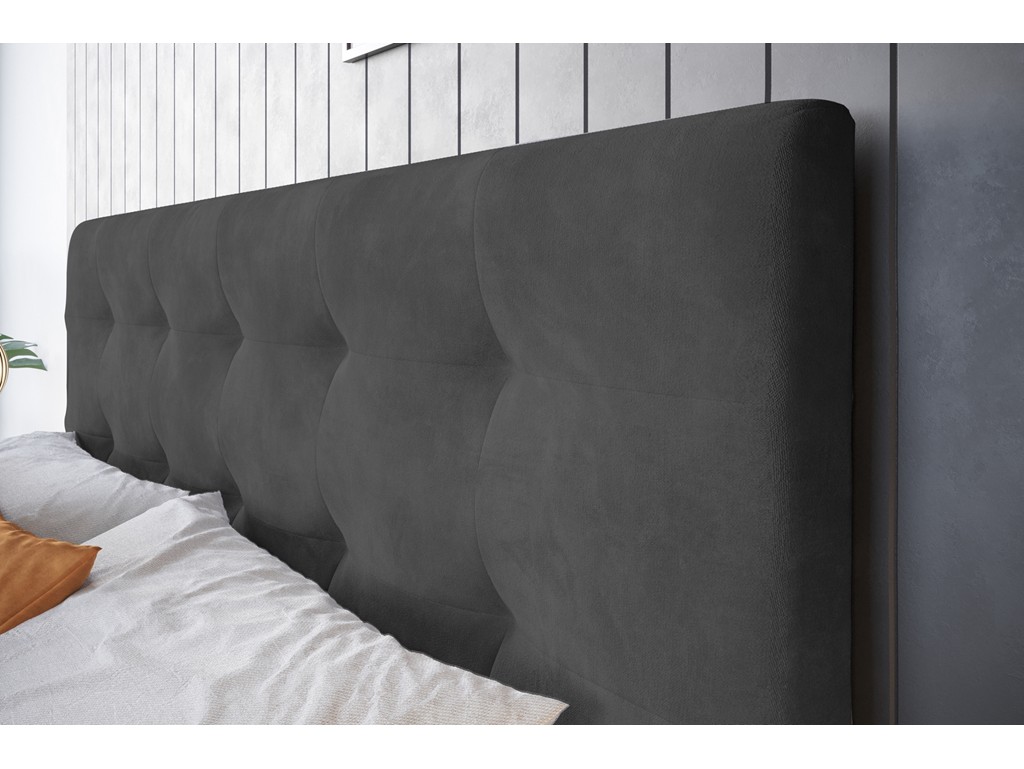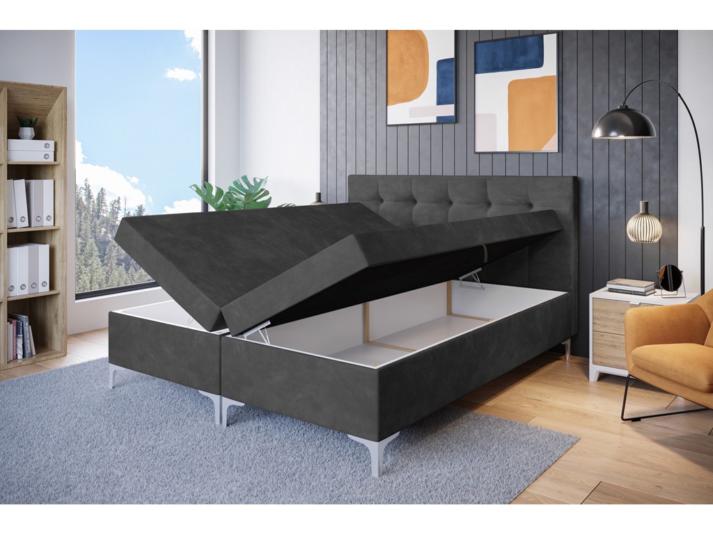 Pikowane wezgłowie i chromowane nóżki dodają wizualnej lekkości, a dwa pojemniki zapewniają wygodne miejsce na pościel.