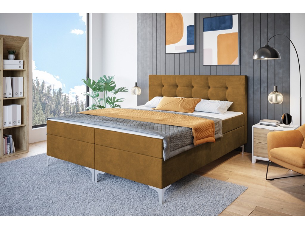 Łóżko kontynentalne Lilu w rozmiarze 160 cm w tkaninie Monolith 48 w odcieniu miodowym łączy elegancję z codzienną wygodą. Aksamitny welur z delikatnym połyskiem wprowadza przytulny, luksusowy charakter do sypialni. Wbudowany materac bonelowy oraz dwa pojemniki na pościel zapewniają funkcjonalność i komfort użytkowania.