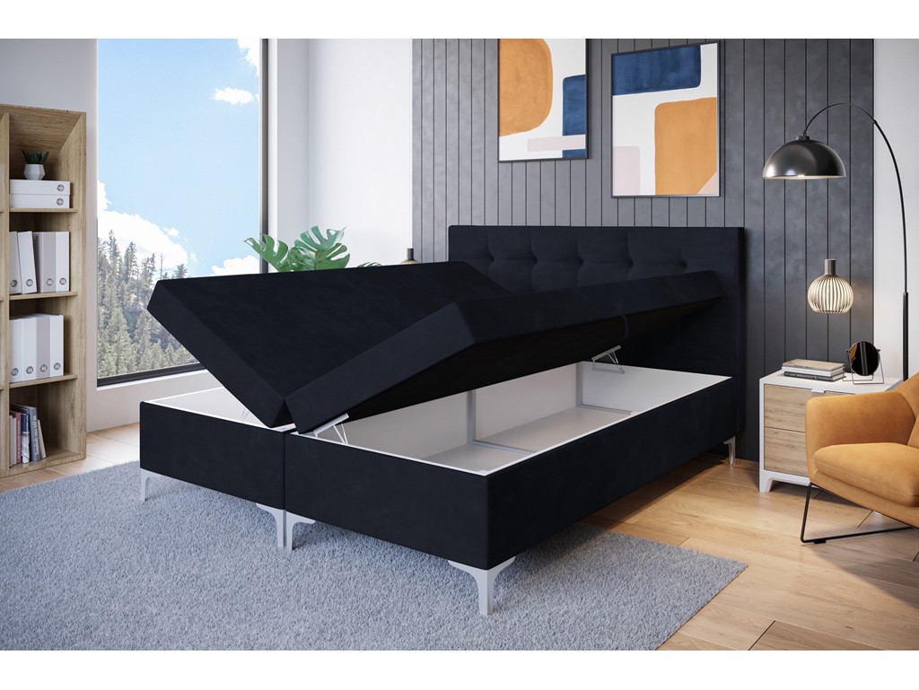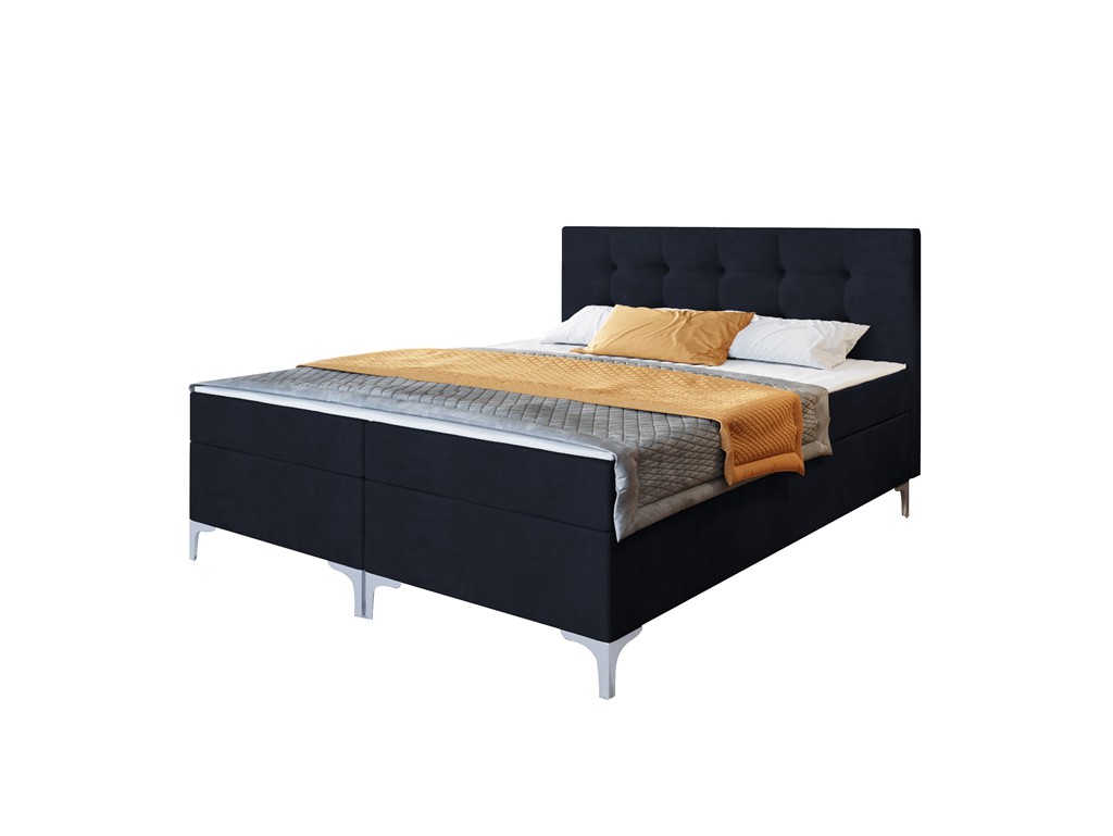 Łóżko kontynentalne Lilu w rozmiarze 180 cm w aksamitnej tkaninie Monolith 79 w ciemnym granacie to elegancka propozycja do nowoczesnych i klasycznych sypialni. Wysokie chromowane nóżki nadają mu lekkości, a wbudowany materac bonelowy zapewnia stabilne podparcie. Dwa pojemniki na pościel zwiększają funkcjonalność mebla.