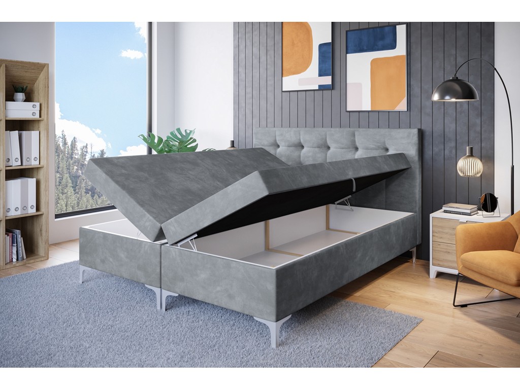 Łóżko kontynentalne Lilu w rozmiarze 160 cm to harmonijne połączenie nowoczesnej formy i codziennego komfortu snu. Tapicerka z weluru Monolith 84 w jasnoszarym odcieniu subtelnie rozjaśnia wnętrze, a pikowane wezgłowie i chromowane nóżki nadają całości elegancki charakter. Model dostępny z wbudowanymi pojemnikami na pościel.