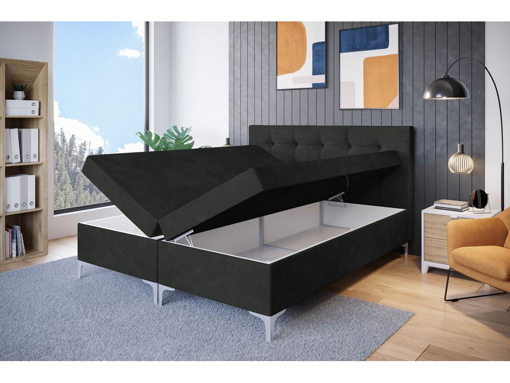 Łóżko kontynentalne Lilu w rozmiarze 140 cm tapicerowane tkaniną Kronos 34 w kolorze ciemnego szarego, to kompaktowa propozycja do mniejszych sypialni. Pikowane wezgłowie, aksamitna struktura materiału oraz wysokie chromowane nóżki nadają bryle elegancki i nowoczesny charakter. Model wyposażono w materac bonelowy oraz dwa pojemniki na pościel.