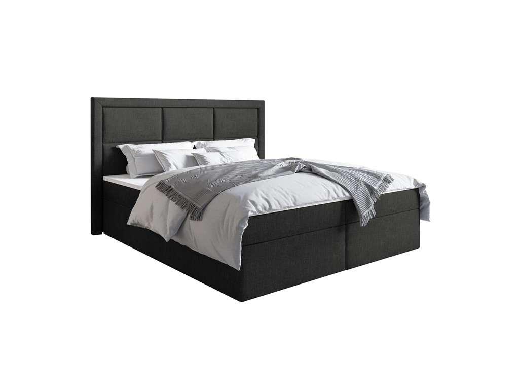 Łóżko Asti w rozmiarze 180 cm to elegancki model kontynentalny z pikowanym wezgłowiem, idealny do przestronnych sypialni. Tkanina Sawana 14 w czarnym odcieniu, aksamitna i przyjemna w dotyku, wprowadza nowoczesny i luksusowy charakter. Wbudowany materac bonelowy z pianką o zwiększonej gęstości zapewnia stabilne podparcie i komfort snu, a dwa pojemniki na pościel pomagają utrzymać porządek w sypialni.