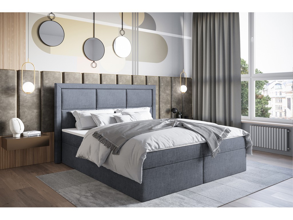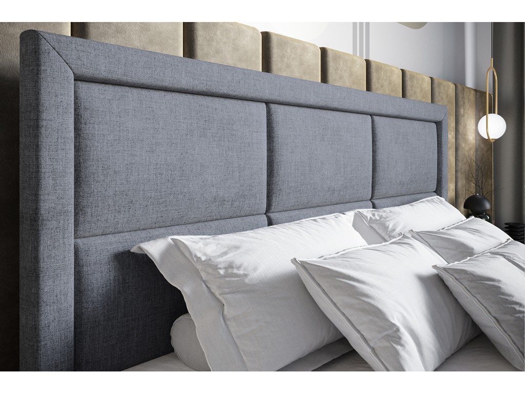 Pikowane wezgłowie podkreśla estetykę, a kontynentalna konstrukcja z dwoma pojemnikami ułatwia organizację pościeli.