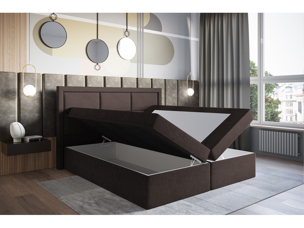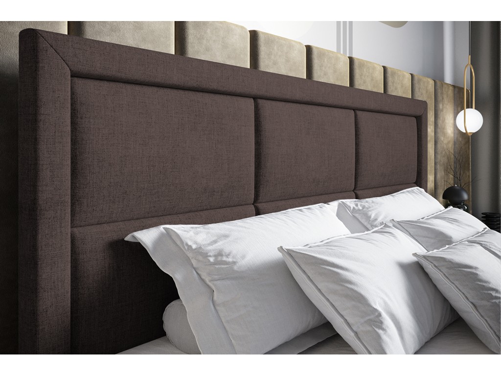 Łóżko Asti w rozmiarze 140 cm to kompaktowe, kontynentalne łóżko z pikowanym wezgłowiem, idealne do mniejszych sypialni. Czekoladowy odcień tkaniny Inari 24 o lnianej strukturze wprowadza przytulny i naturalny charakter wnętrza. Wbudowany materac bonelowy i pianka o zwiększonej gęstości zapewniają stabilne podparcie ciała, a dwa pojemniki na pościel pomagają utrzymać porządek.