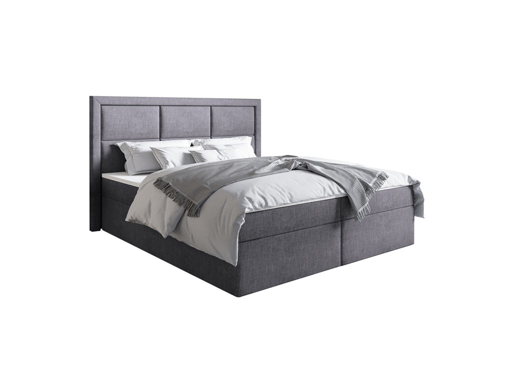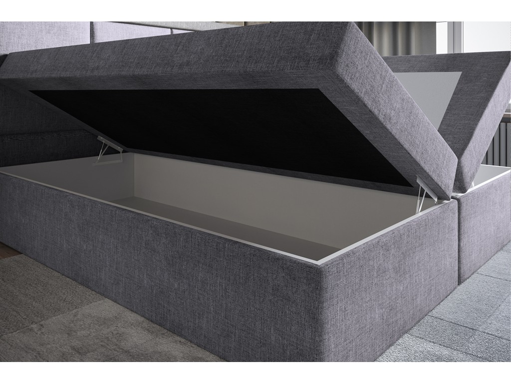 Jasnoszara tkanina Inari 91 nadaje wnętrzu naturalnego charakteru, a kontynentalna konstrukcja z pojemnikami ułatwia przechowywanie i codzienne użytkowanie.