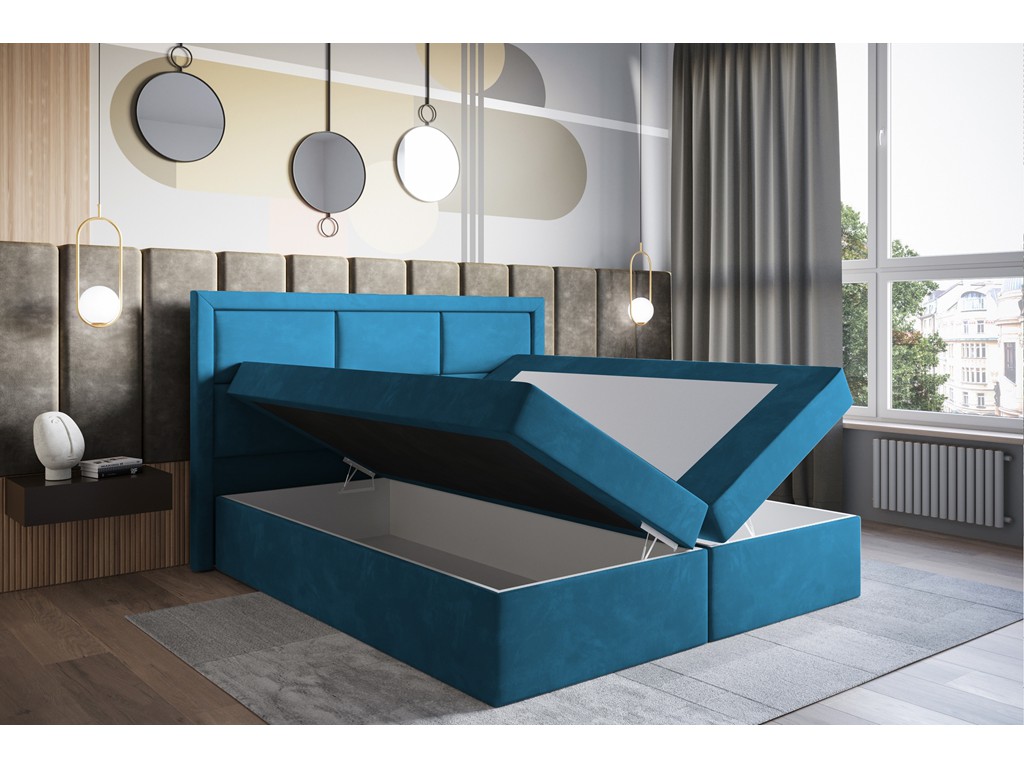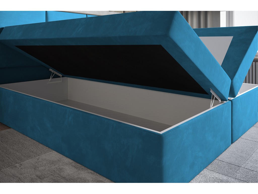 Łóżko Asti w rozmiarze 140 cm to kompaktowe, nowoczesne łóżko kontynentalne z pikowanym wezgłowiem, idealne do mniejszych sypialni. Aksamitna w dotyku, lazurowa tkanina Kronos 13 wprowadza wyrazisty kolor i elegancki charakter. Materac bonelowy oraz pianka o zwiększonej gęstości zapewniają komfort snu, a dwa pojemniki na pościel zwiększają funkcjonalność.