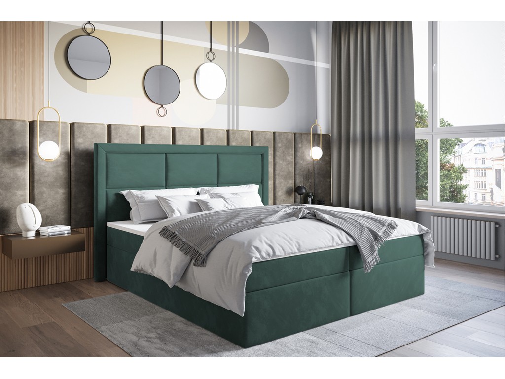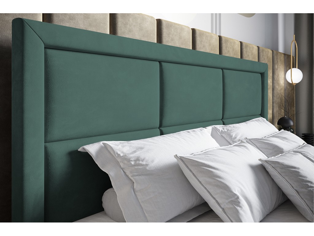 Pikowane wezgłowie zapewnia wygodne podparcie, a kontynentalna konstrukcja z pojemnikami na pościel sprawia, że łóżko łączy estetykę z funkcjonalnością.